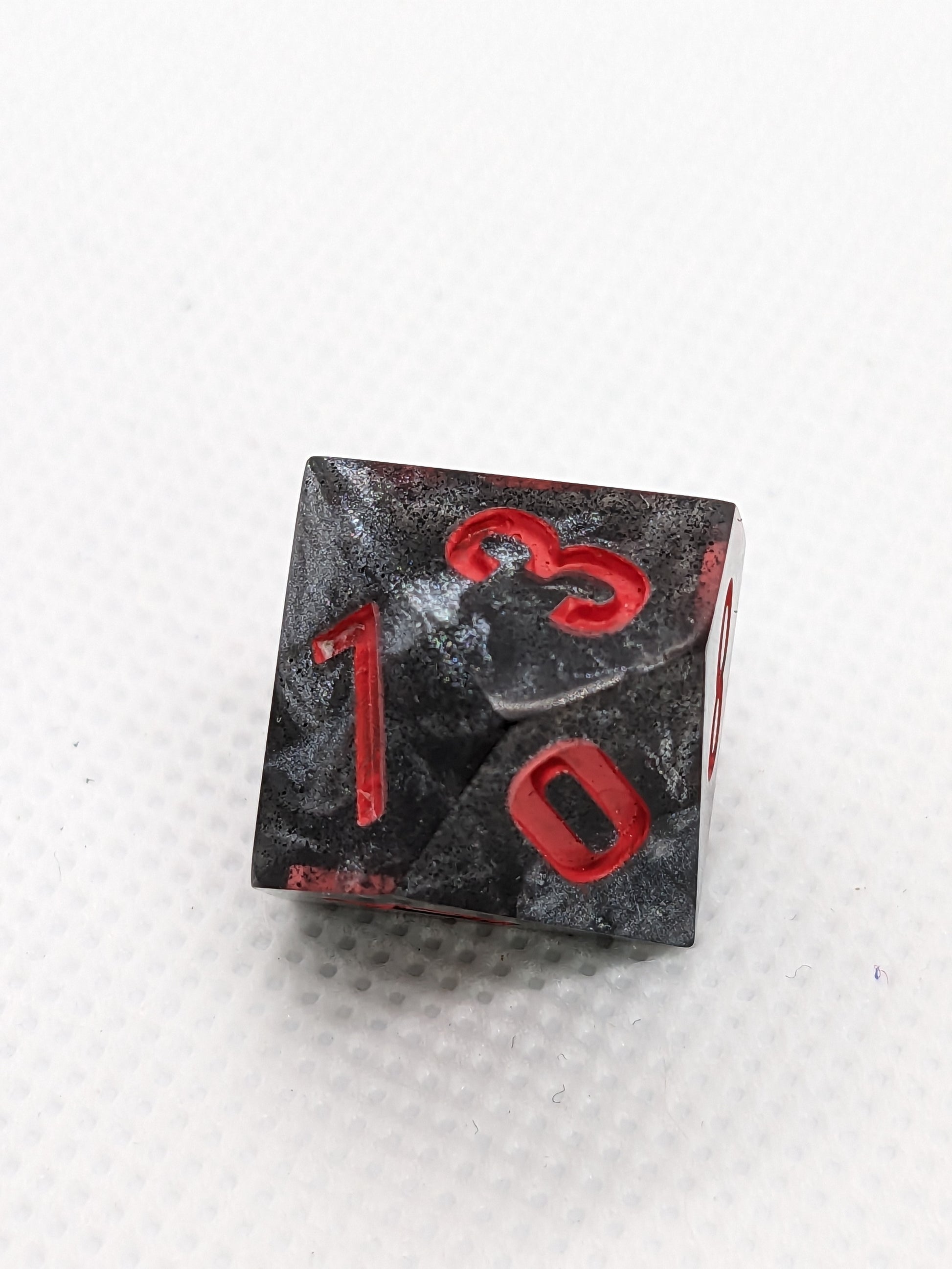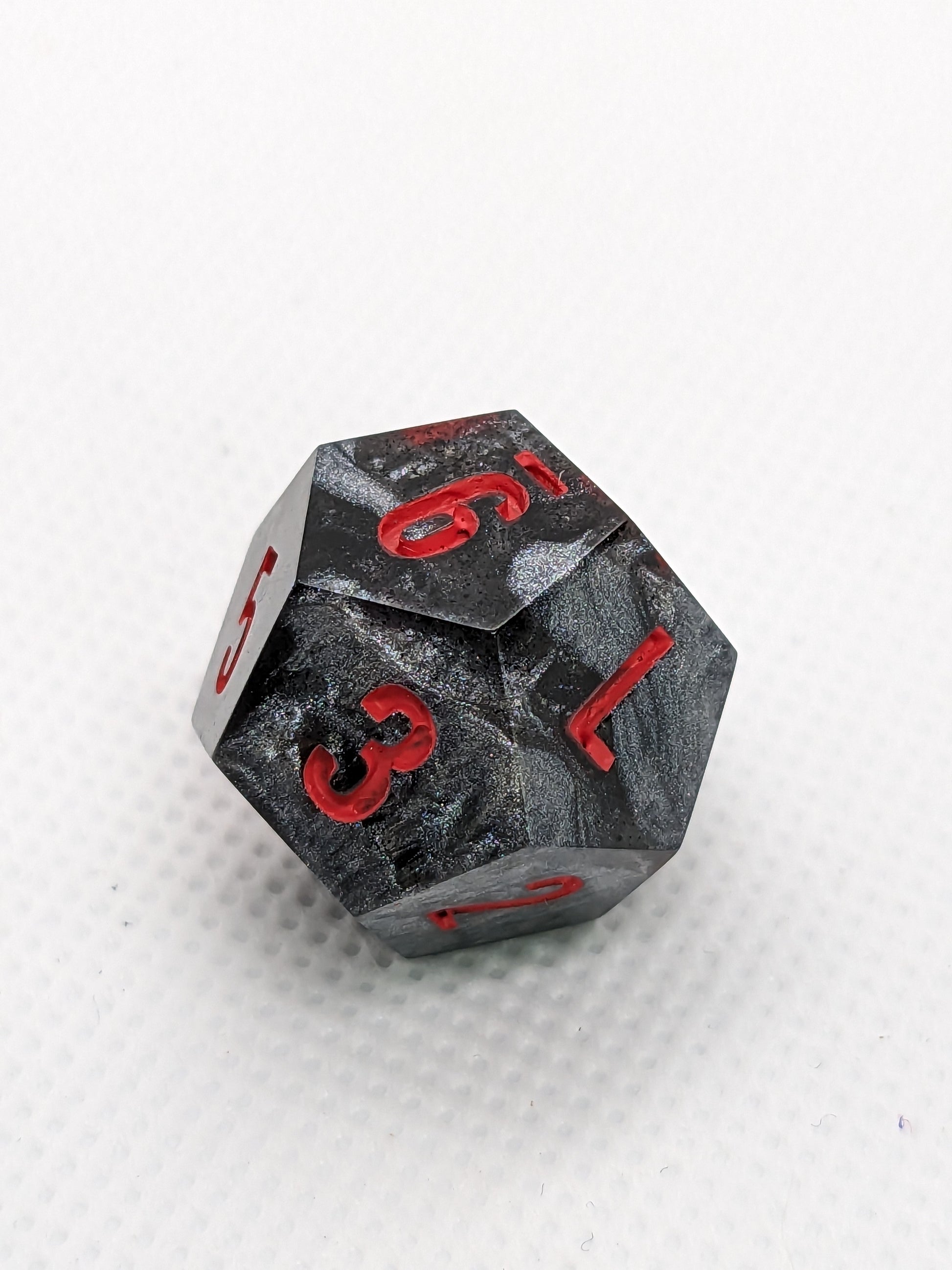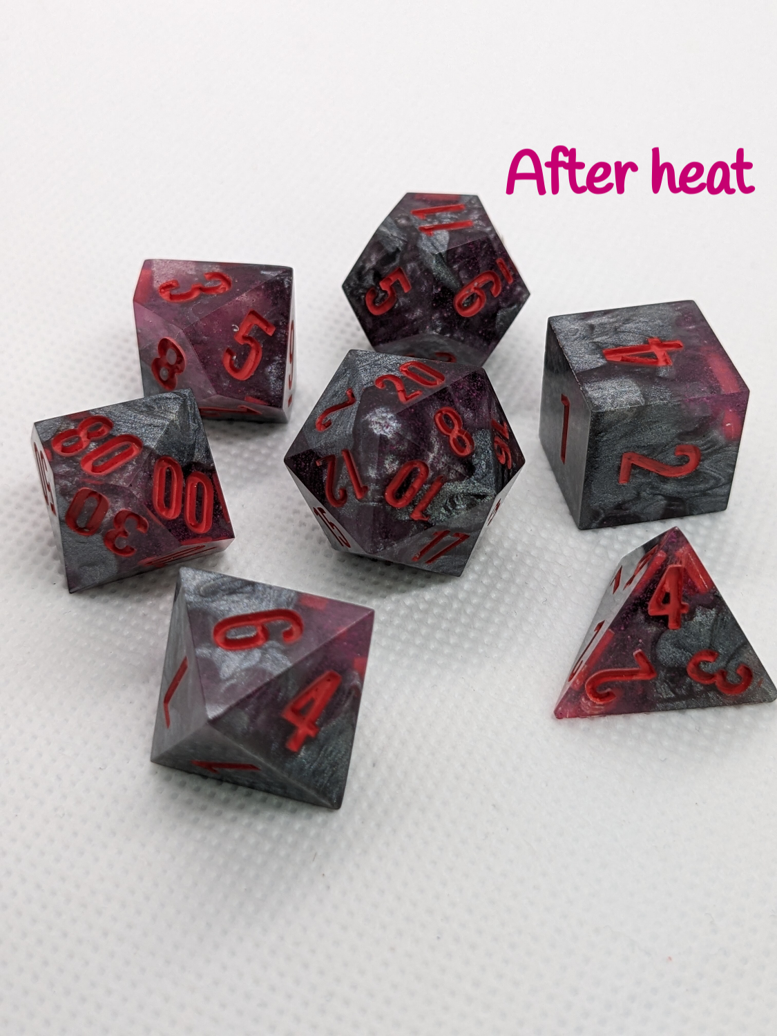 This set was an experiment using thermo-shifting pigment, that I realized in hindsight is not very useful in dice. When these dice are exposed to sufficient heat the black segments of these dice will shift to a bright fuchsia!