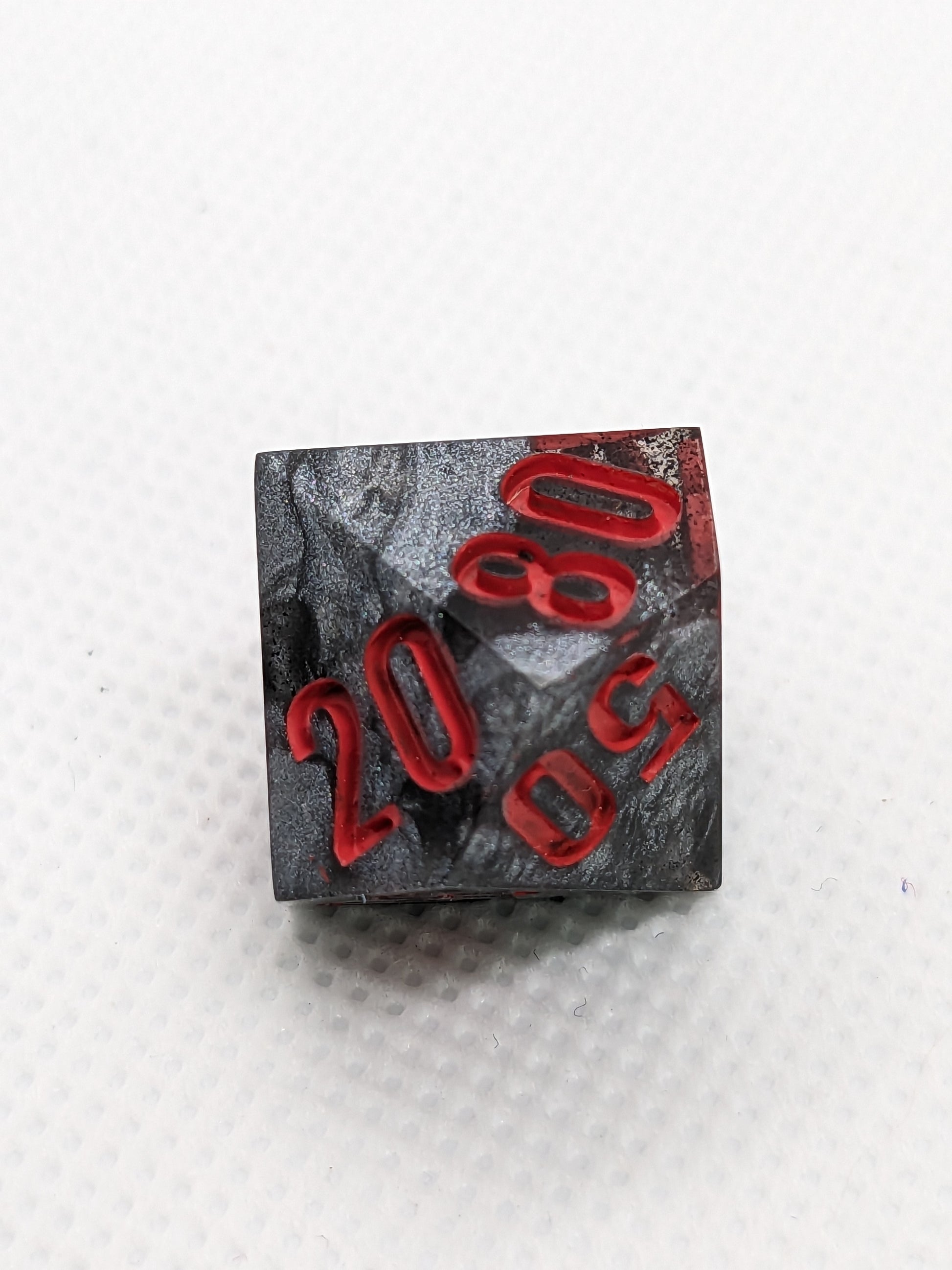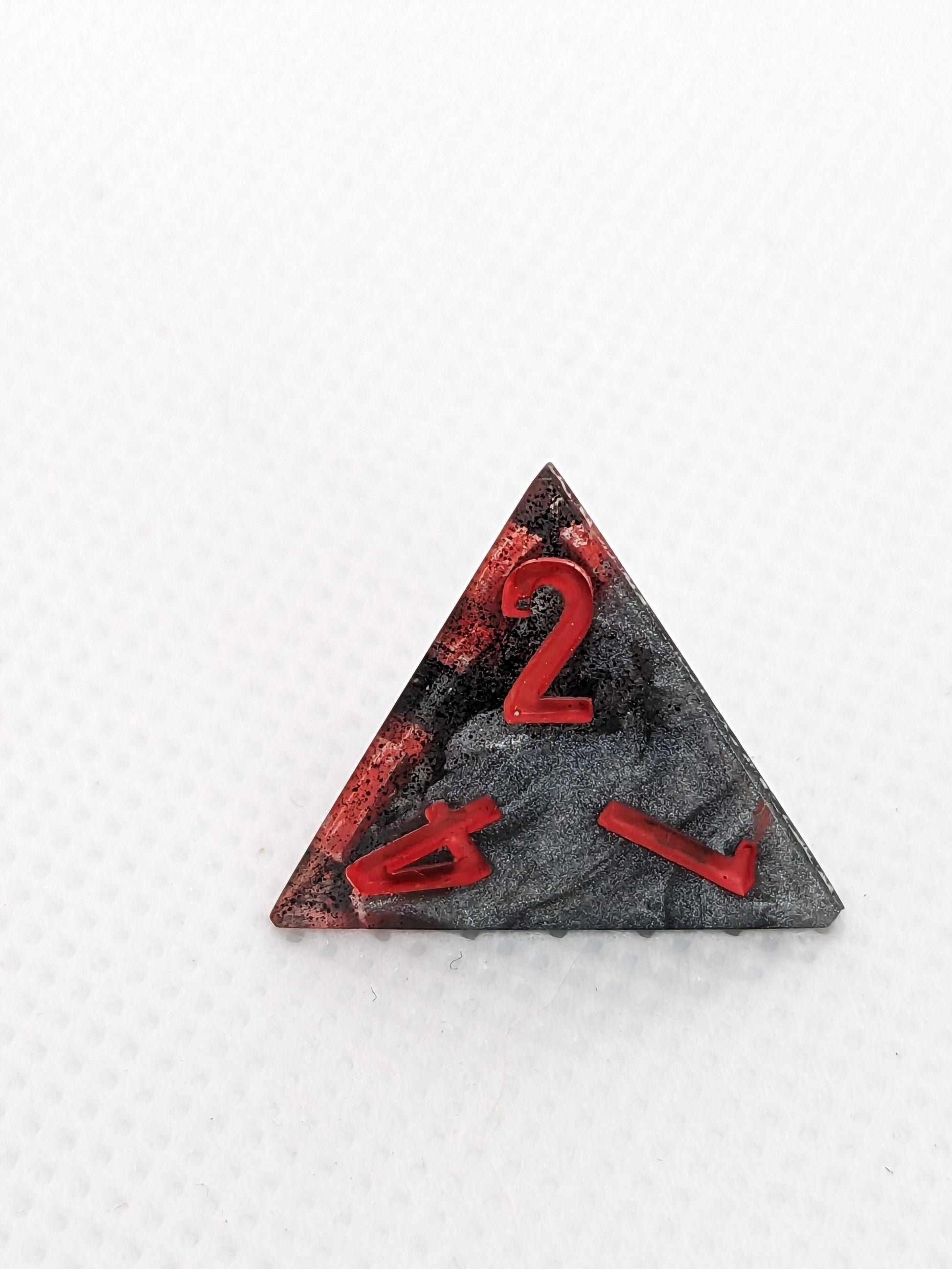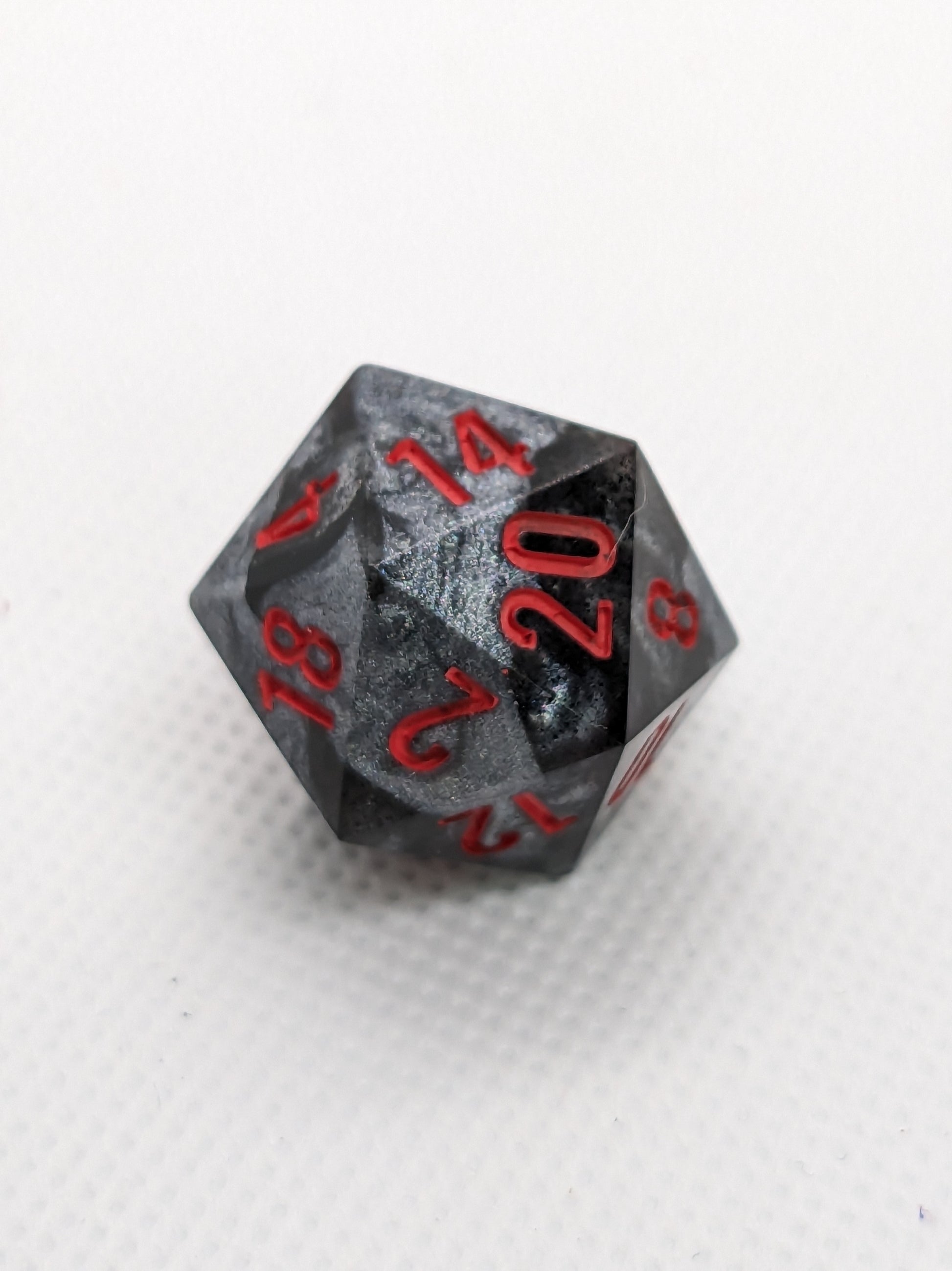 This set was an experiment using thermo-shifting pigment, that I realized in hindsight is not very useful in dice. When these dice are exposed to sufficient heat the black segments of these dice will shift to a bright fuchsia!
