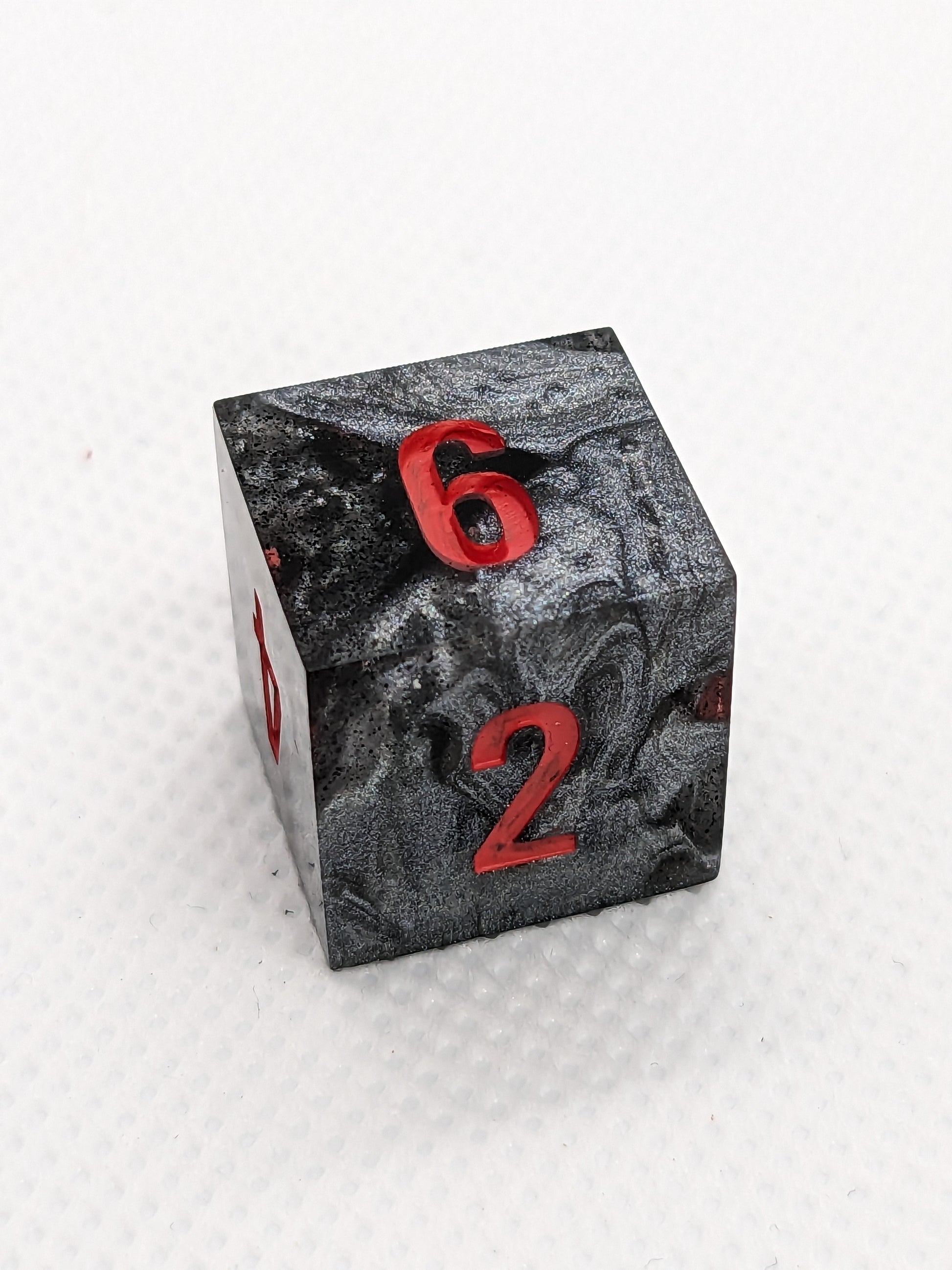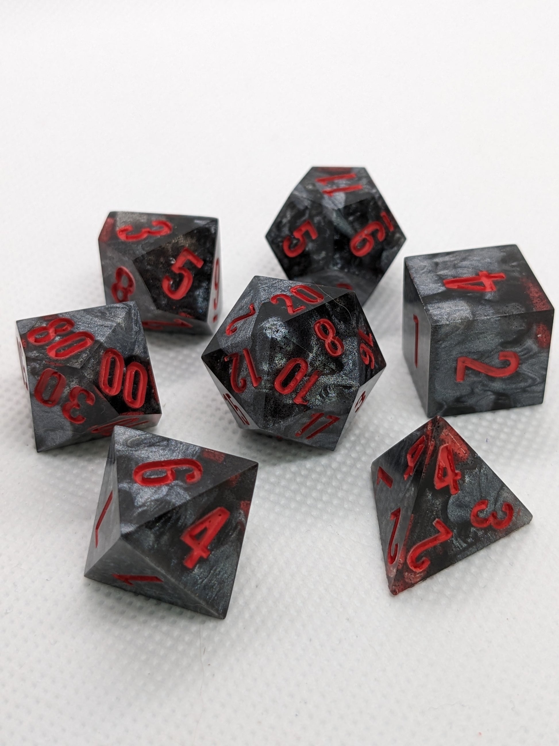 Swirls of metallic grey and black coming together to form this set of hardened dice.